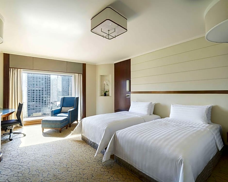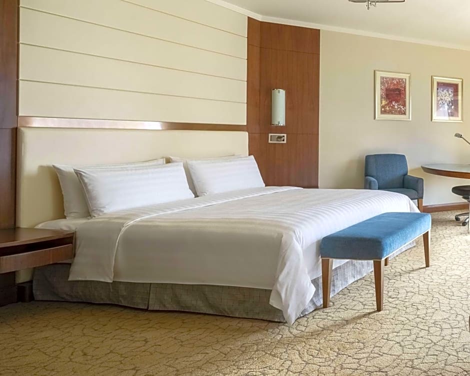Decorated in a graceful Asian-influenced style, this spacious room features full-length windows overlooking the Beijing cityscape. It has a Herman Miller chair and DVD player.